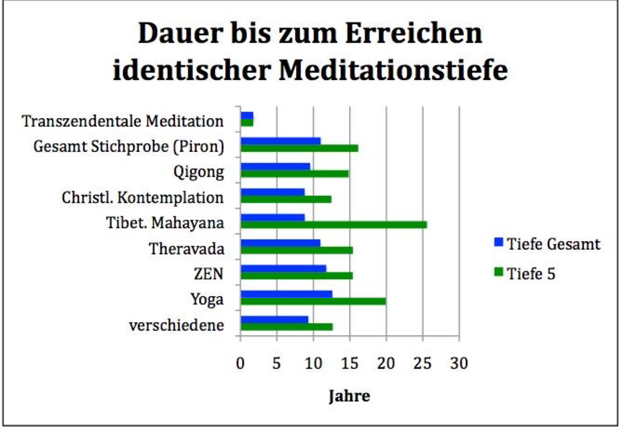 Die Berechnung äquivalenter Zeiten für das Erreichen gleicher Meditationstiefe über Regressionsgleichungen bei den Meditationsrichtungen, deren Datenlage eine signifikante Korrelation zwischen Meditationstiefe (gesamt und Tiefebereich 5) und „Praxis in Jahren“ zu bestimmen erlaubte, ergaben recht unterschiedliche Zeiträume: Von 8.80 (christl. Kontemplation) bis zu 12.61 Jahren (Yoga)(gesamt) und von 12.47 (christl. Kontemplation) bis 19.93 Jahren (Yoga) (Tiefebereich 5). Der Referenzwert der TM - Meditierenden beträgt 1.7 Jahre (gesamt und Tiefe 5) In drei Fällen (Tibet. Mahayana, Transzendentale Meditation) waren die Regressionsgeraden wenig steil und die Korrelationen nicht signifikant (Werte in Klammern gesetzt). Die Mahayana Praktizierenden starteten ebenso wie die Transzendentale Meditation mit recht hohen Werten in Meditationstiefe und die TM war recht homogen in Meditationspraxis („Dauer der einzelnen Meditation“).