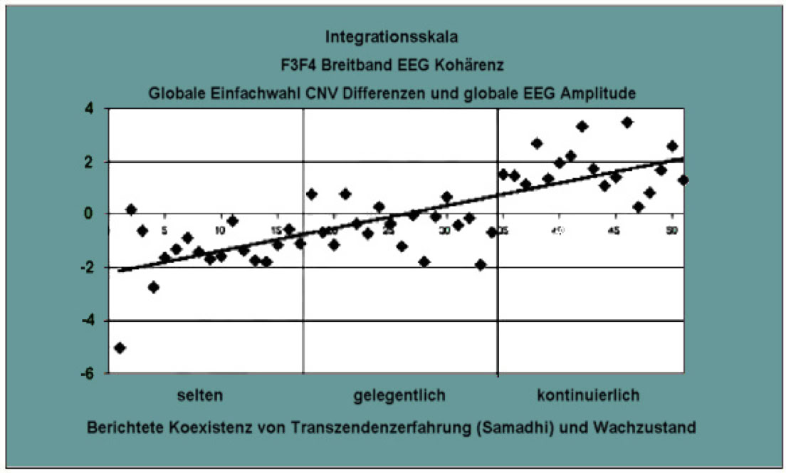 Bei den Meditierenden, die über Koexistenz von Transzendenz mit Wachen und Schlafen berichteten, fiel das Erwartungspotential höher aus in einfachen, jedoch geringer in Wahlreaktionsversuchen (1), die 6-12 Hz EEG Amplitude frontal, zentral und parietal (2) und die frontale Breitband 6-12 Hz-EEG-Kohärenz (3) waren größer während der Wahlreaktionsversuche. Zunahme der EEG-Amplitude und der Kohärenz – charakteristisch für die TM-Praxis – wurden zu einer stabilen EEG-Eigenschaft während der CNV-Aufgaben bei diesen Probanden.