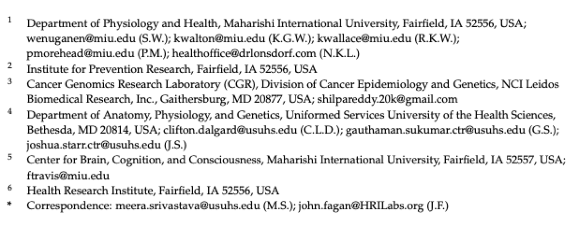 Hintergrund und Zielsetzung: Stress kann adaptive Mechanismen überlasten, was zu gesundheitsschädlichen epigenetischen Effekten führt. Die Forschung zur Umkehrung dieser Effekte steckt noch in den Kinderschuhen. Erste Ergebnisse deuten darauf hin, dass einige Meditationstechniken einen gesundheitlichen Nutzen haben, der mit wiederholter Praxis wächst. Diese Studie konzentrierte sich auf mögliche transkriptomische Effekte von 38 Jahren zweimal täglicher Praxis der Transzendentalen Meditation® (TM®). Materialien und Methoden: Zunächst wurde mit Hilfe der Illumina® BeadChip Microarray-Technologie nach Unterschieden in der globalen Genexpression in peripheren mononukleären Blutzellen (PBMCs) zwischen gesunden Praktizierenden und eng angepassten Kontrollen (n = 12, Alter 65) gesucht. Zweitens wurden diese Microarray-Ergebnisse für eine Untergruppe von Genen mittels quantitativer Polymerase-Kettenreaktion (qPCR) verifiziert und mittels qPCR in größeren TM- und Kontrollgruppen (n = 45, Alter 63) validiert. Für die bioinformatische Untersuchung wurden die Pakete Ingenuity® Pathway Analysis (IPA®), DAVID, Genomatix und R verwendet. Ergebnisse: Die 200 Gene und Loci, die in dem Microarray-Experiment die strengen Kriterien für eine differentielle Expression erfüllten, zeigten kontrastierende Expressionsmuster, die die beiden Gruppen unterschieden. Am deutlichsten waren die Expressionsunterschiede in Bezug auf die Immunfunktion und die Energieeffizienz. In der TM-Gruppe waren im Vergleich zur Kontrolle alle 49 mit Entzündungen assoziierten Gene herunterreguliert, während Gene, die mit antiviralen und Antikörper-Komponenten der Abwehrreaktion assoziiert sind, hochreguliert waren. Die größten Expressionsunterschiede zeigten sich bei sechs Genen, die mit der Funktion der Erythrozyten in Verbindung stehen und offenbar einen Zustand geringerer Energieeffizienz in der Kontrollgruppe widerspiegeln. Ergebnisse, die diese Genexpressionsunterschiede unterstützen, wurden mit qPCR-gemessener Expression sowohl in den gut angepassten Microarray-Gruppen als auch in den größeren, weniger gut angepassten Gruppen erhalten. Schlussfolgerungen: Diese Befunde stimmen mit Vorhersagen überein, die auf Ergebnissen früherer randomisierter Meditationsstudien beruhen, und könnten Hinweise auf stressbezogene molekulare Mechanismen liefern, die der Verringerung von Angst, posttraumatischer Belastungsstörung (PTSD), kardiovaskulären Erkrankungen (CVD) und anderen chronischen Störungen und Krankheiten zugrunde liegen.